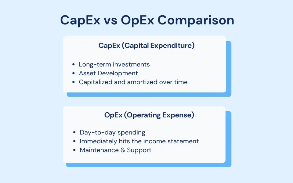 What is the key difference between CapEx and OpEx? CapEx (Capital Expenditures for long-term investments) gets capitalized and amortized over time, while OpEx (Operating Expense for everyday spend) hits your income statement right away. Understanding which bucket to put labor costs in is important. Labor associated with building or improving long-term assets can be capitalized under CapEx. Meanwhile, labor tied to keeping the business running falls under OpEx. Get this wrong, and your financials might be telling the wrong story.