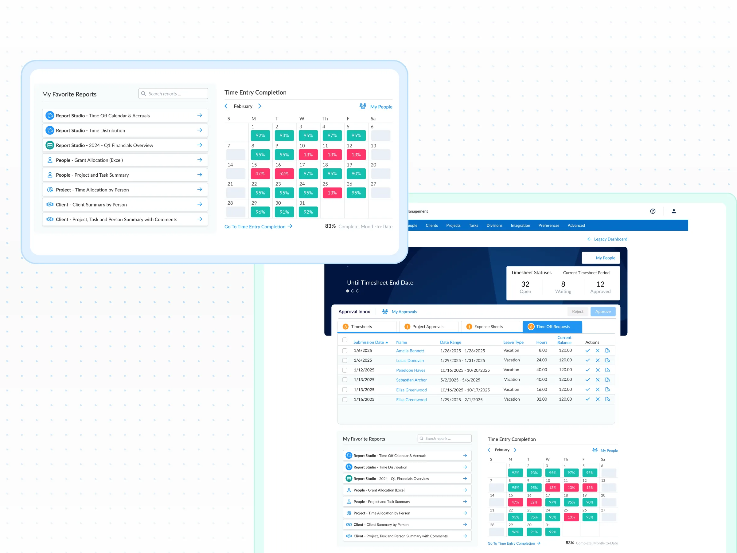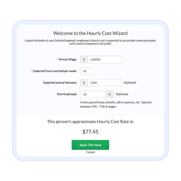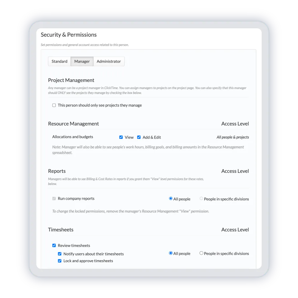 Only a handful of employees will ever need access to sensitive information such as company budgets, costs, or billing rates. Unless you say otherwise, employees can only make entries on their own timesheets, submit expenses, run personal reports, and view their time off balances.