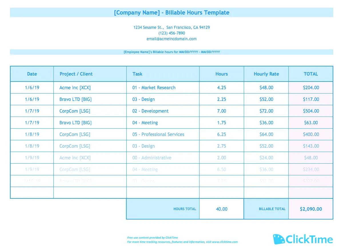 ClickTime’s billable hours template will help you track, manage, and plan how you and your team bill for their time. The template can be printed or simply viewed in Excel or Google Sheets. As your rates, projects, employees, or clients change, simply update the template and save the file!