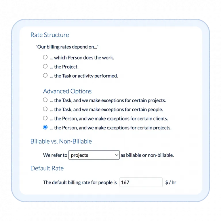 Whether you bill on a retainer model, have a flat rate for each employee or have much more complicated billing structures, you can change rates based on a combination of the employee, client, project, and task at hand.