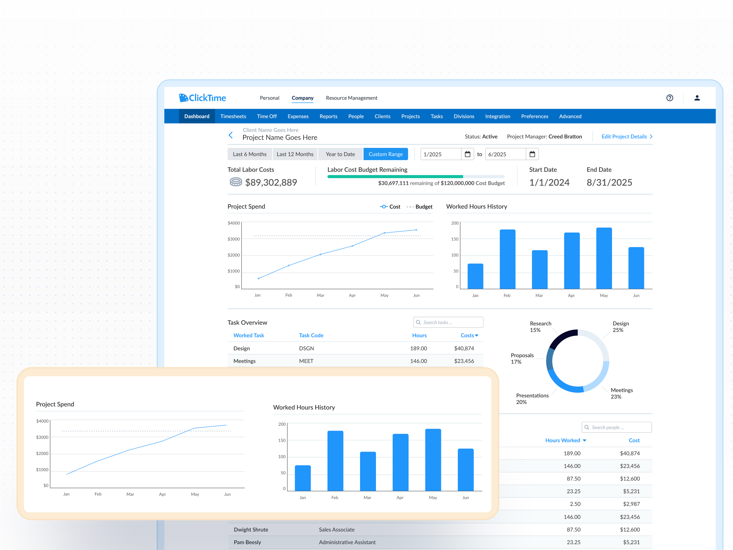 ClickTime estimates the hourly cost rate of each of your employees. Our time tracking system will use these estimates to show you the ongoing cost of your work in progress. This way, you’ll be able to predict in-flight labor expenditures before they hit the books.